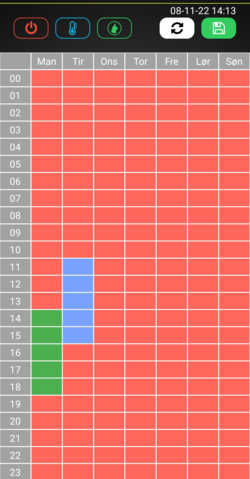 - Lundi, le poêle est programmé pour fonctionner à un certain niveau de puissance de 14h à 18h (cases vertes).